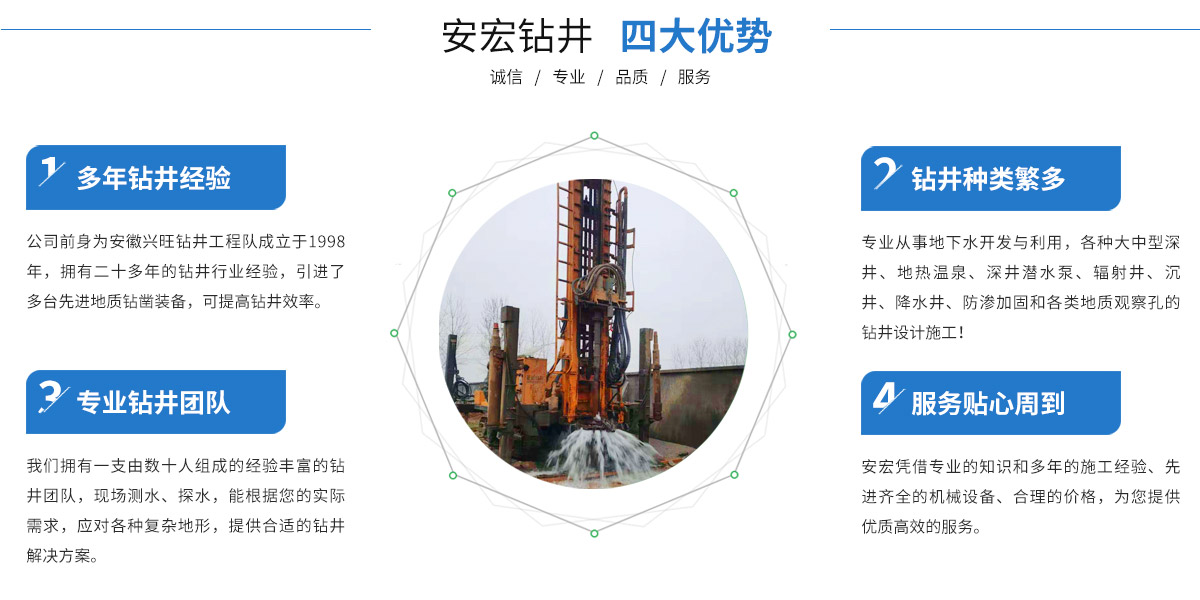 寧國市安宏鉆井工程有限公司,前為安徽興旺鉆井工程隊成立于1998年,公司從事安徽鉆井(宣城打井、寧國打井、蕪湖打井、池州打井、宿州打井、桐城打井、銅陵打井、南陵打井、郎溪打井、廣德打井、績溪打井、馬鞍山打井等),江蘇鉆井(南京打井、高淳打井...
